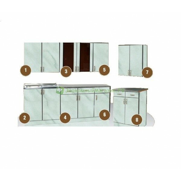 Представленный кухонный гарнитур №2 собирается по элементам и выполняется в 2-х цветах: бук, каррара.