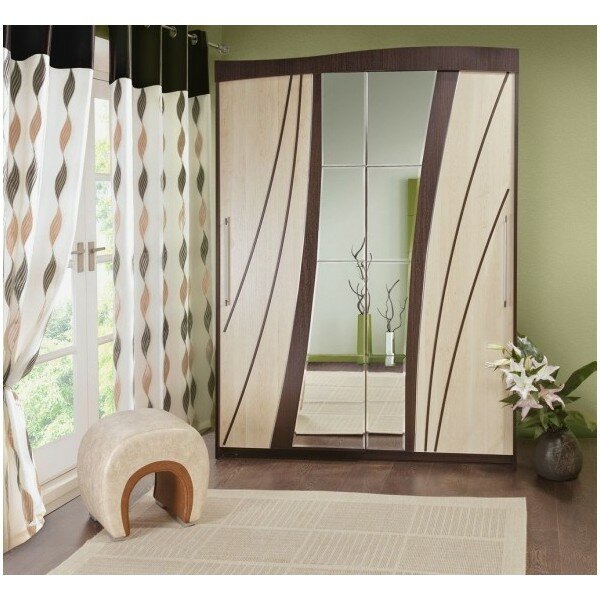 Шкаф оснащен системой подвесных дверей разделен внутри на две секции. Левая секция шкафа оборудована нишей с четырьмя полками. Справа секция с антресольной полкой и горизонтальной штангой для одежды. Шкаф-купе изготавливается с оригинальными комбинированными дверями, выполненными из ЛДСП двух контрастных цветов с накладками из МДФ. Зеркала наклеены на двери в заводских условиях. Двери укомплектованы удобными металлическими ручками. Законченный вид шкафу придает декоративный козырек.