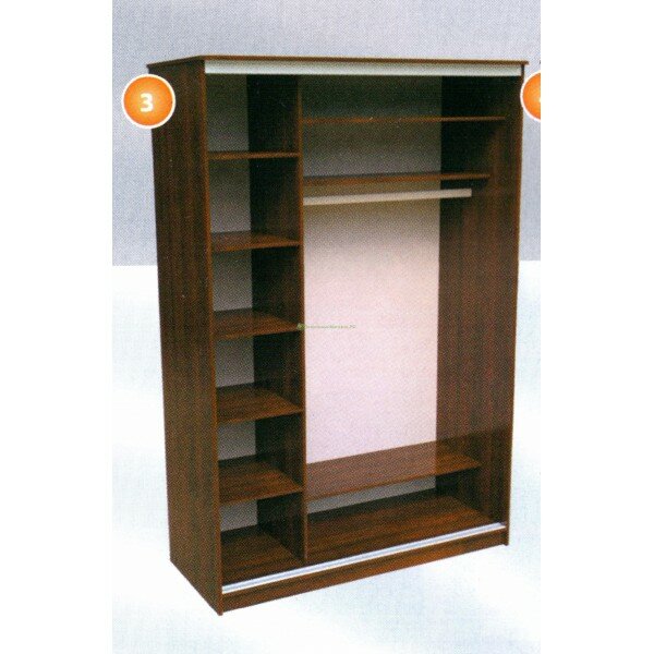 Характеристика: Шкаф-купе разделен внутри на две не равные секции. Правая секция оборудована антресольной и нижней полками и горизонтальной штангой для одежды. Слева располагается ниша с пятью полками.