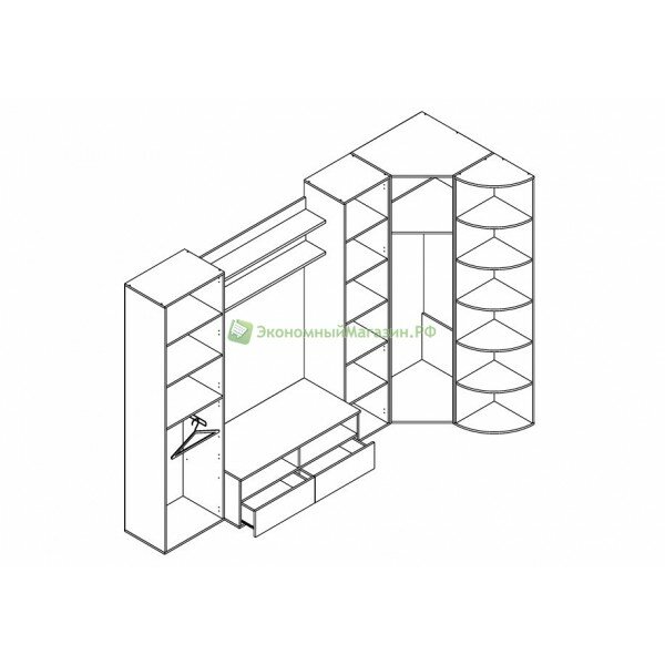 Каждое отделение шкафа комплектуется двумя полками, нижнее отделение — универсальное, убрав полки можно использовать выдвижную штангу для вешалок, которая уже входит в комплектацию гарнитура. Угловой шкаф большой и вместительный, комплектуется штангой для вешалок.
